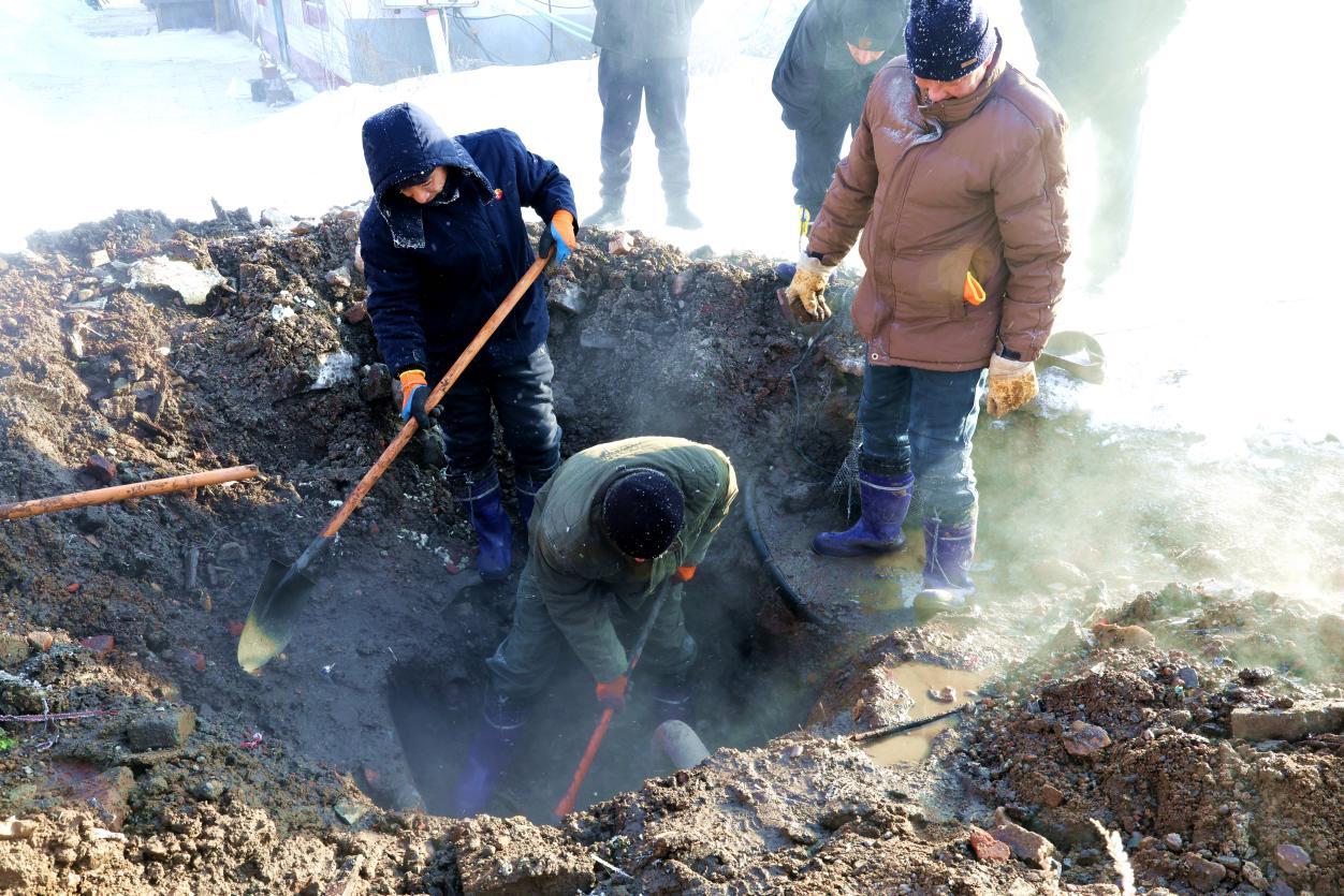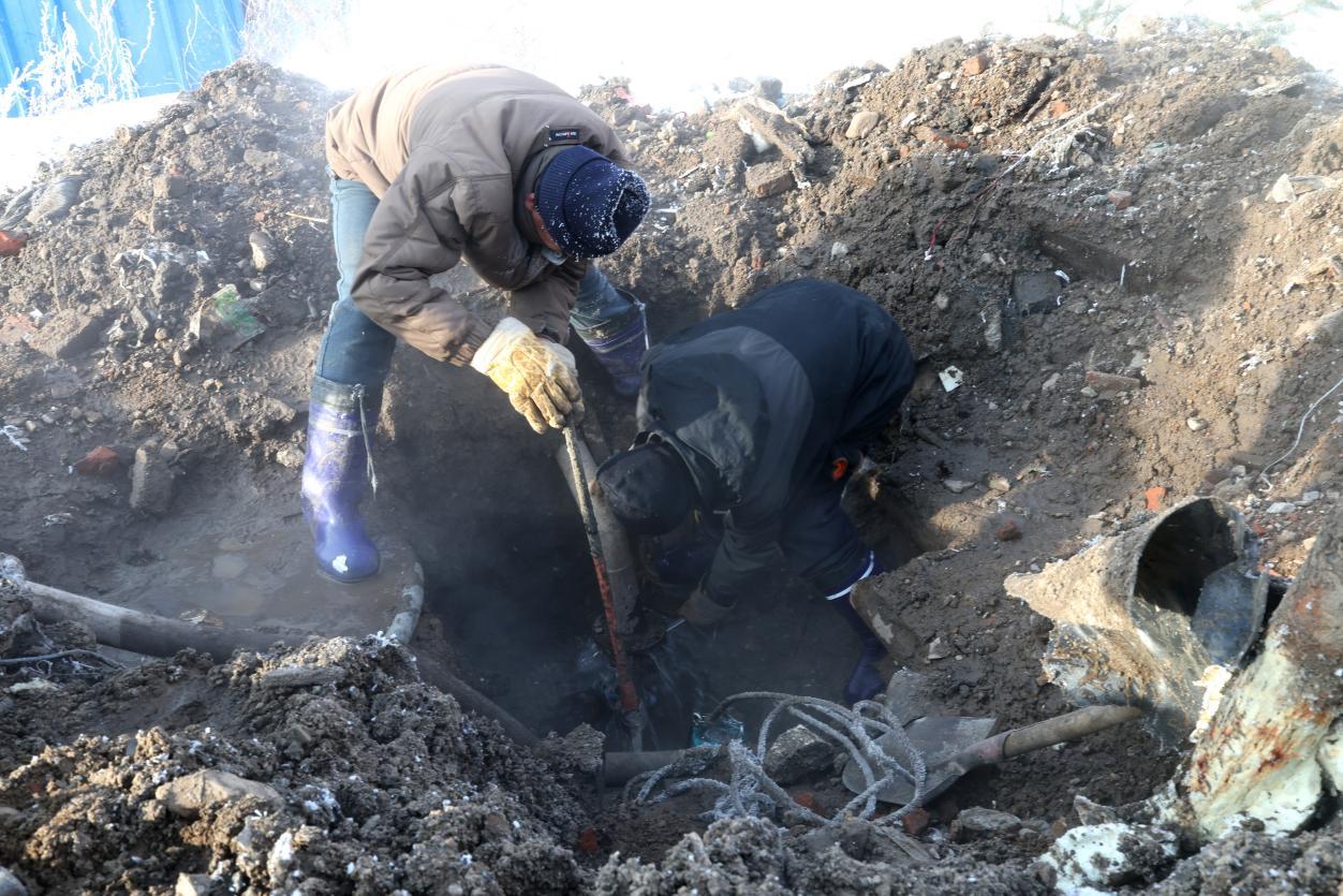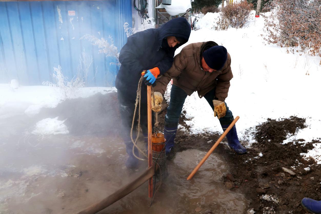 當日早8時許,物業(yè)公司巡線員巡查時發(fā)現(xiàn)西華路平房區(qū)地面冒熱水,立即上報并啟動搶修預(yù)案。7名搶修人員火速趕赴現(xiàn)場,現(xiàn)場分工明確、緊張有序,有的安裝水泵排水,有的接駁應(yīng)急電源,有的揮鎬刨挖凍土層,同時調(diào)配小型挖溝機輔助作業(yè)。