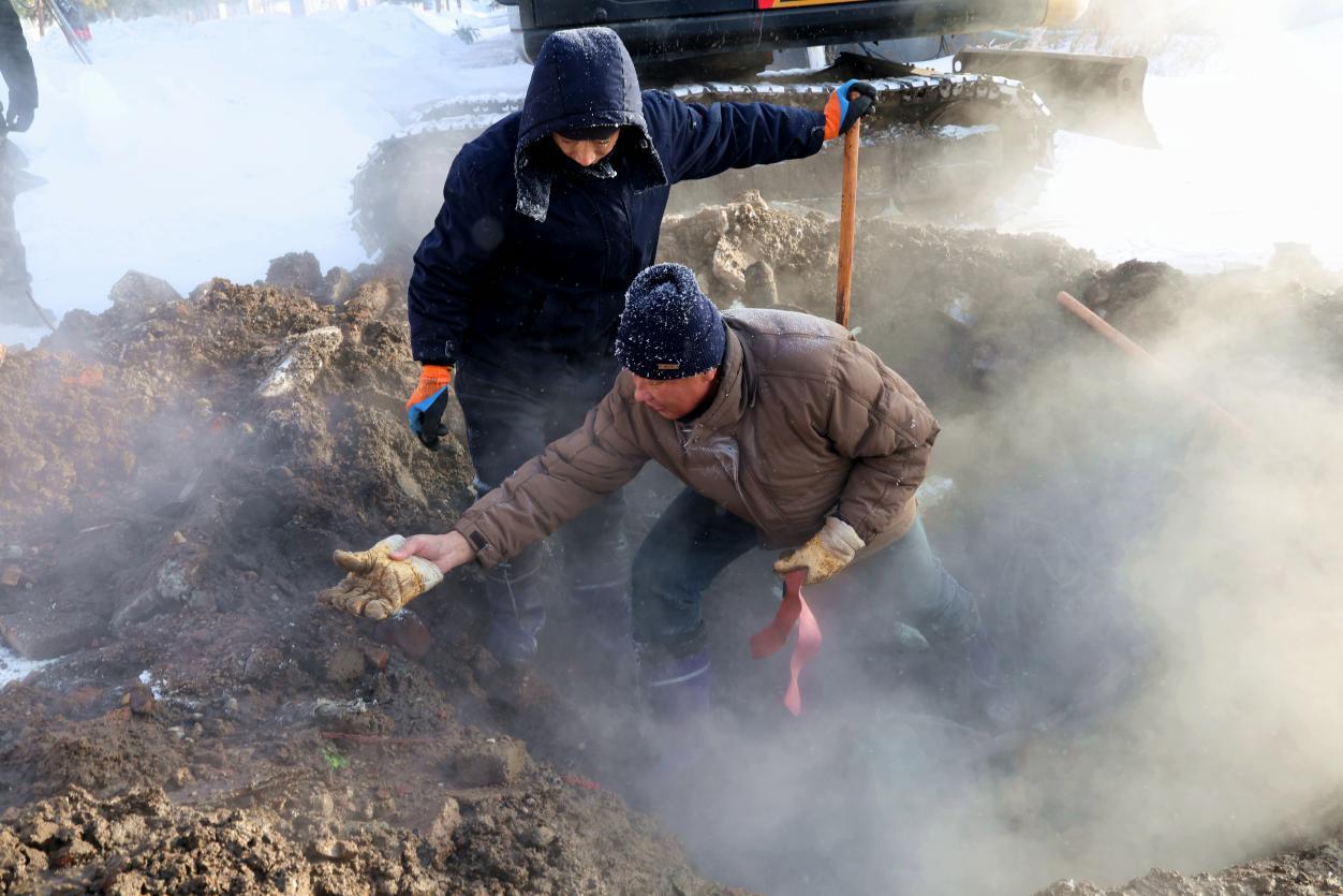 因地下管線錯綜復(fù)雜,且極寒天氣易導(dǎo)致管道凍裂,搶修人員采取邊供暖、邊排水、邊人工開挖的方式推進作業(yè),防止管線被凍擴大輻射面。地面破開后熱水持續(xù)涌出,搶修人員輪番上陣,清理凍土、排查漏點,歷經(jīng)3小時奮戰(zhàn),至11時40分挖出1.8立方米深坑,精準定位漏點為供暖分線軟接頭老化,此時跑水量已達每小時4噸。為控制漏損,搶修人員當即關(guān)閉分線閥門,受此影響,周邊20余戶居民供暖暫時中斷。
