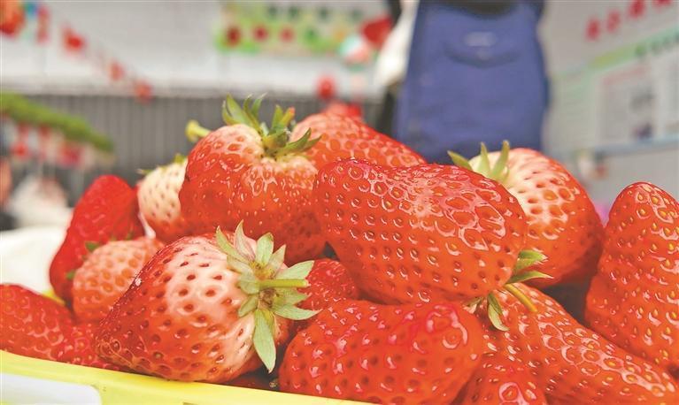 “這還有個(gè)大的,可紅啦。”翠綠的草莓架下,小朋友拎著籃子來回穿梭,游客一邊采摘一邊品嘗。這里的草莓潔凈鮮亮,摘下來不用洗就能直接吃,咬一口,清甜的草莓汁溢滿唇齒。