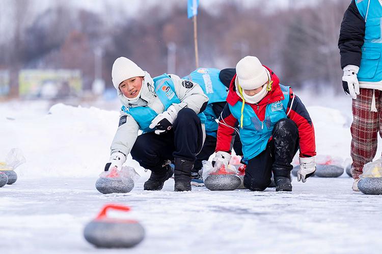 希望與愛(ài)手拉手主題公益研學(xué)活動(dòng)中,孩子們玩室外冰壺