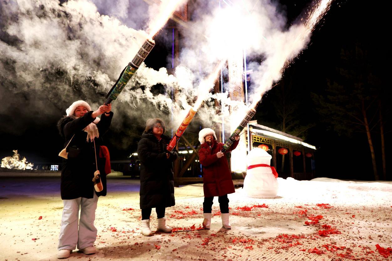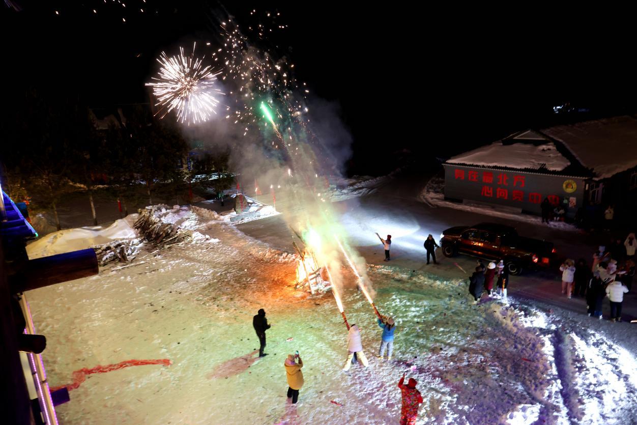 夜幕降臨,龍河驛站燈火璀璨。游客們圍站在一起,揉面團(tuán)、搟面皮、包餃子,歡聲笑語不斷。熱氣騰騰的團(tuán)圓飯上桌,大家舉杯同慶高歌,共賀新春。篝火點(diǎn)燃,煙花綻放,清脆的鞭炮聲響徹雪野,大人孩子盡情歡跳、嬉戲,雪地成了歡樂的海洋,笑聲、歡呼聲與冰雪美景相融,繪就一幅溫暖喜慶的新春畫卷。