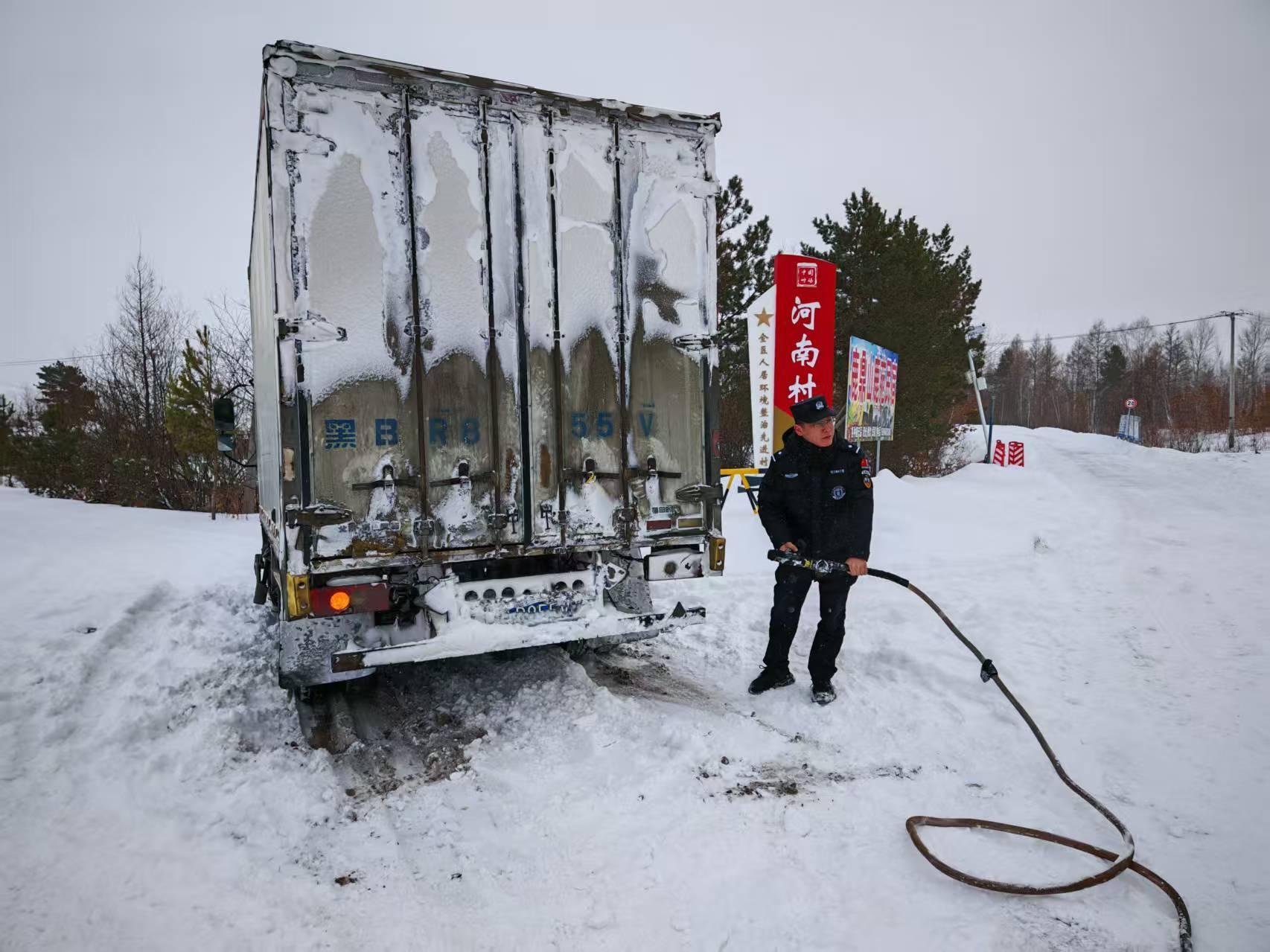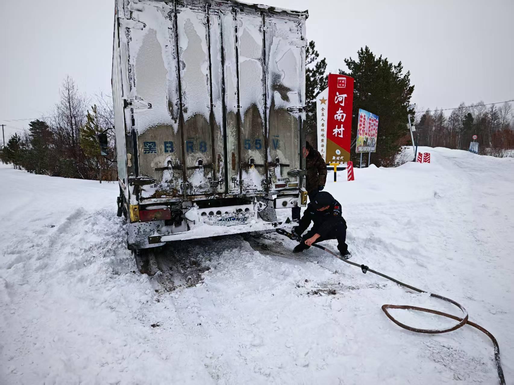 交警大隊(duì)接到G331國道河口執(zhí)勤點(diǎn)求助稱有一輛廂式貨車因積雪過厚、路面濕滑、不慎陷于深雪中無法移動,導(dǎo)致車輛被困。