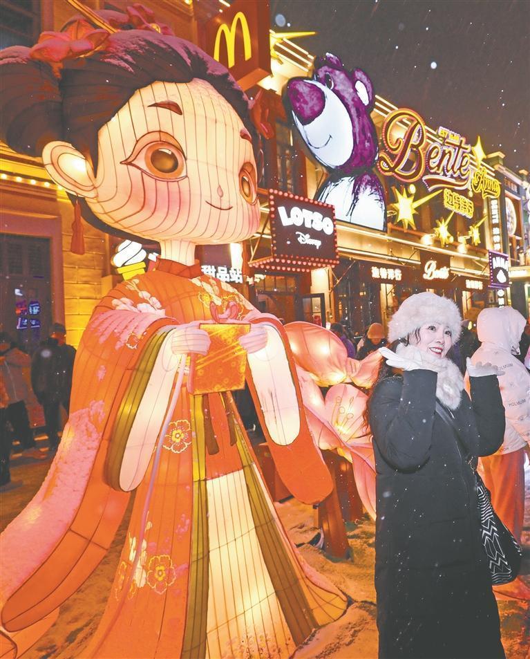 當日,鵝毛大雪悄然灑落,覆蓋中央大街、松花江畔、中華巴洛克歷史文化街區(qū)等景區(qū)的各式花燈。紅燈籠覆上薄雪,愈顯艷麗;冰雕彩燈與雪相映,光影夢幻,將雪的清冽與燈的暖輝完美融合,整座城市宛如一幅雪景燈畫。