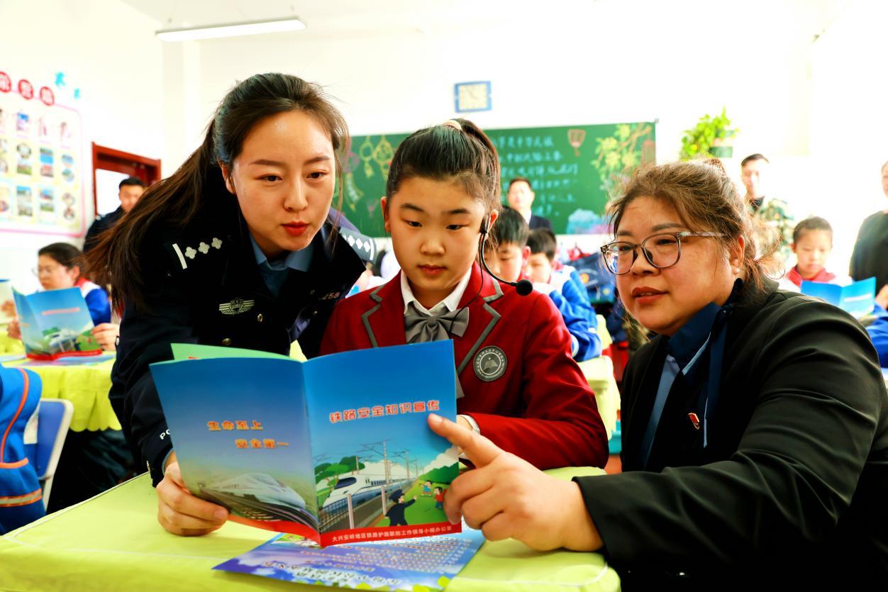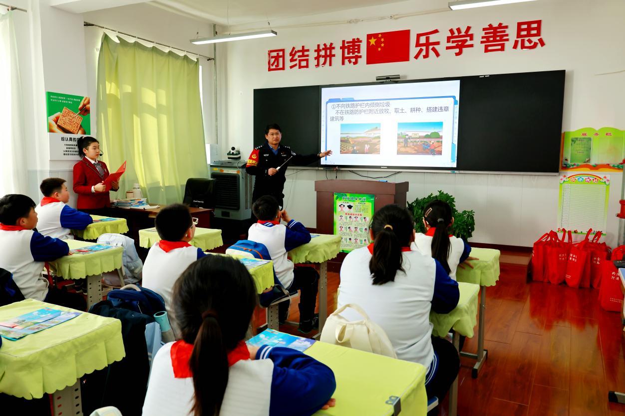 阿木爾向陽派出所的干警與阿木爾林業(yè)局護路辦工作人員在向小學生講解愛護鐵路相關知識(王力 攝)